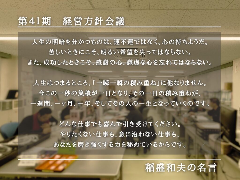 ミーティングの中で、京セラ創業者である稲盛和夫氏の、私たちの日々の仕事にも通じる大切な教えが紹介されました。